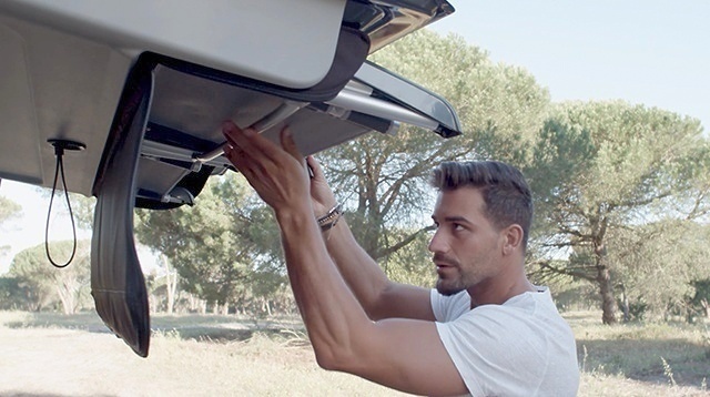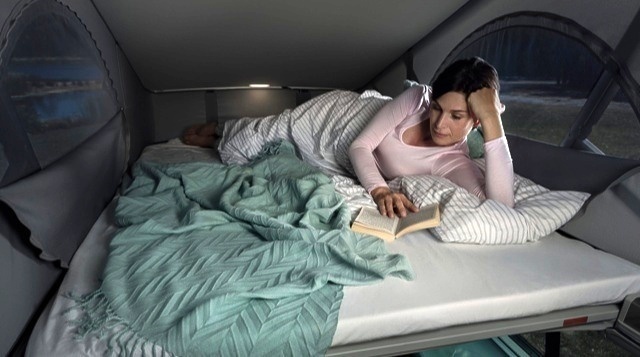 Dieses Bett wird vom Innenraum ausgefaltet und schafft so einen Schlafraum über dem Fahrzeug. So wird der Wohnraum im Fahrzeug nicht eingeschränkt.