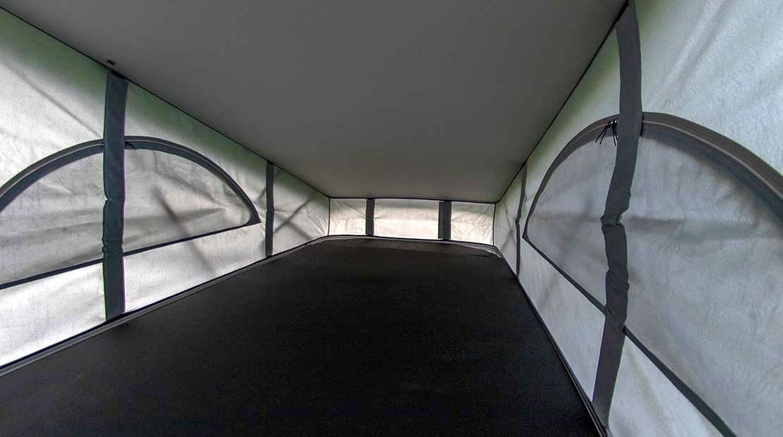 Dieses Bett wird vom Innenraum ausgefaltet und schafft so einen Schlafraum über dem Fahrzeug. So wird der Wohnraum im Fahrzeug nicht eingeschränkt.